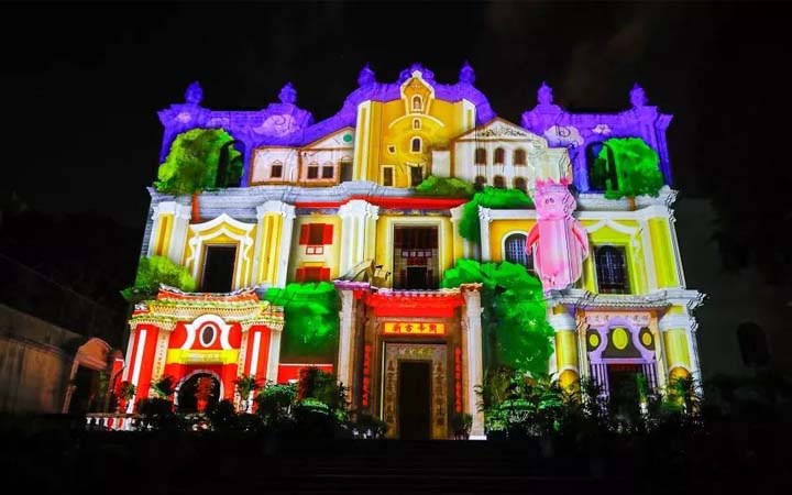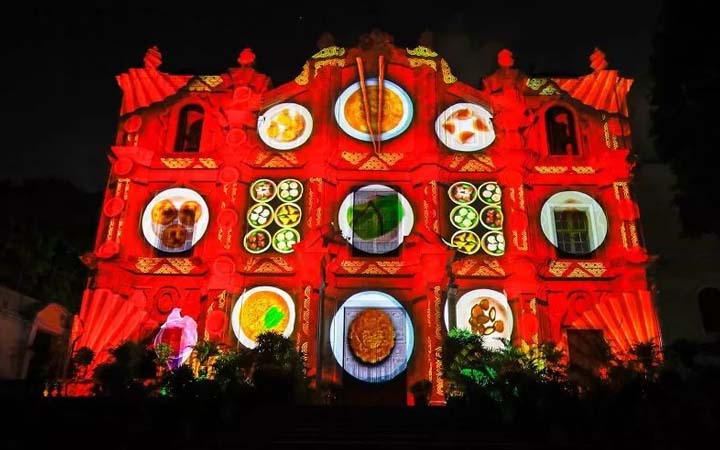 而今年恰逢澳門回歸20周年,光影節(jié)的光雕表演以“慶祝澳門特別行政區(qū)成立20周年”為主題。本次光影節(jié)制作團(tuán)隊來自西班牙、深圳及澳門本地團(tuán)隊共同為具有標(biāo)志性建筑的大三巴牌坊披上炫麗的彩衣。