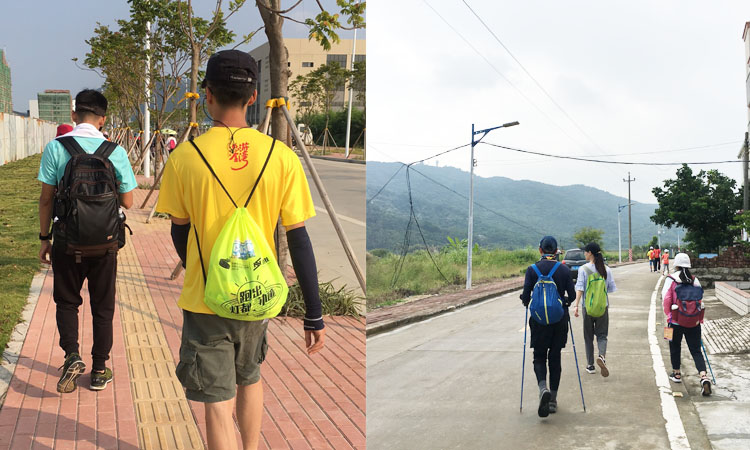 從剛開始的喜眉笑眼的狀態(tài),翻過幾座山后出現(xiàn)體力開始下降,甚至出現(xiàn)膝蓋受傷、腳掌起泡、腰酸背痛等等運動過量的反應(yīng)時,大家心里都有一個惡魔在耳邊回旋著一個聲音:“你不行了,你走不動了,你放棄吧”,甚至還有別的參賽者中途坐上公交車、打上了嘀嘀順豐車的跑了,那個時候隊員們心里無比沮喪.
