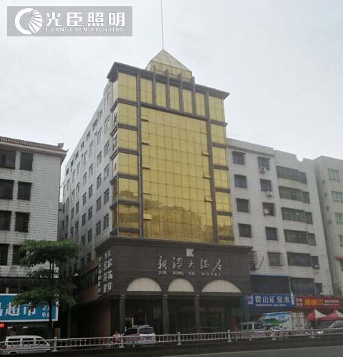 本次酒店外墻亮化選用了LED線條燈做為簡(jiǎn)單的輪廓勾勒、LED星光燈及點(diǎn)光源作為墻面點(diǎn)綴燈具,一閃一閃的效果相當(dāng)耀眼,由于墻角安裝燈具的面積有限,光臣照明特意定制一批與墻面安裝尺寸相符的LED墻角燈,發(fā)光效果十分好看。為了讓酒店塔頂顯得更加奪目,添加了金燦燦的36W金黃光洗墻燈突顯它的造型感。