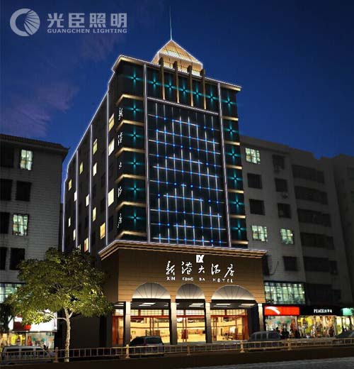 河源新港大酒店屬于外墻翻新工程,初期亮化選用了外控護(hù)欄管和點(diǎn)光源作為外墻裝飾燈具,多年后酒店方覺得方案跟不上時(shí)代審美,所以重新設(shè)計(jì)安裝一批新的亮化燈具。
