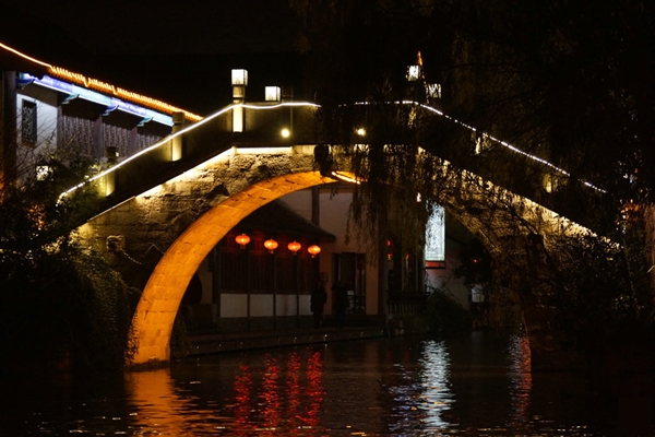 LED亮化讓水街的夜景更為誘人,臨水而立的亭臺樓閣,具有鹽城水鄉(xiāng)風(fēng)情和海鹽歷史文化風(fēng)貌的景區(qū)特色,在燈光的映襯下更具內(nèi)涵,樓閣、石橋、水、燈光融合成秦淮勝境的美景。