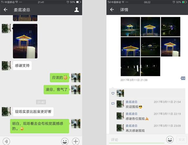 上周六晚上,客戶到現(xiàn)場觀看涼亭亮化效果,被現(xiàn)場美麗的景象給迷住了,忍不住發(fā)了個朋友圈讓大家也一同欣賞,另外他還特意給我們的業(yè)務(wù)經(jīng)理發(fā)了現(xiàn)場圖片,感謝他的認可與支持,也歡迎大家來電咨詢:18826034118