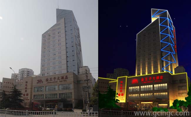 金王子大酒店作為當?shù)氐囊蛔貥诵越ㄖ?,酒店方對亮化這一塊非常重視,亮化方案不能太過于浮夸、手法不能太重、耗電不能過大等等,施工方肖總也是方案改了一次又一次,關于耗電這個問題也就意味著布燈的數(shù)量不能多,盡量少。但是燈具少了布燈的方案要配合好,不然會影響整體效果。