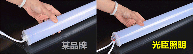 1、PC外殼:光臣照明選用的PC外殼是重量達到180g~200g的PC管(常規(guī)以180g為主,可定制200g以上重量),產(chǎn)品厚度均勻透光性及抗壓能力好。和市面上的80~90g標價8元/米的LED數(shù)碼管質(zhì)量相比,沒有可比性。