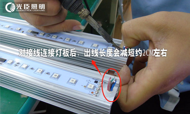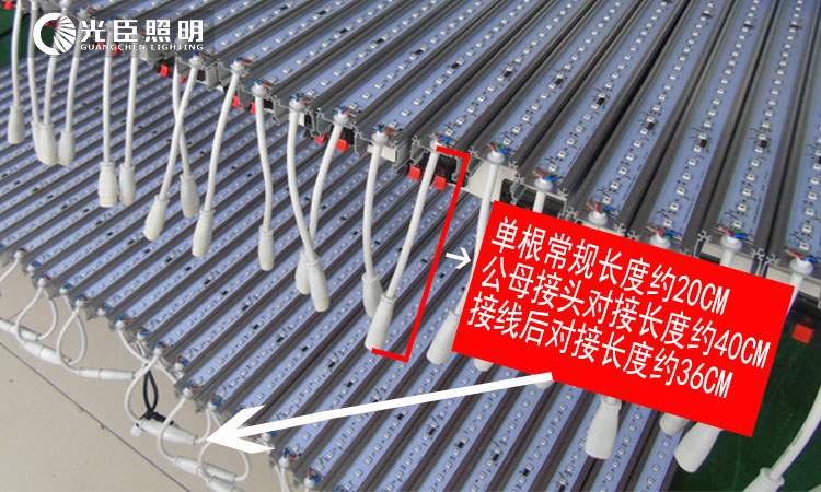 拿光臣智科的LED線條燈為例,我們的防水接頭,一般對接長度在40CM左右,除去燈體內(nèi)部的接線距離,出線路離大約36CM左右,目前大部分線條燈選用底部出線工藝,出線長度出會相對短一些。