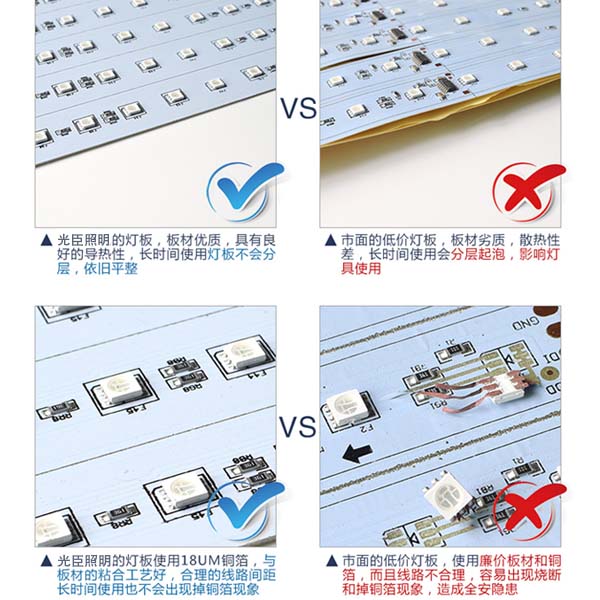 針對(duì)PCB板材的材質(zhì)來(lái)分析,PCB板也有分很多種質(zhì)量層次,市面上大部份廉價(jià)的線條燈選用的是二次料的PCB板材,這種板材在受熱后容易分層、銅箔太薄容易掉、粘合性不好銅箔層和PCB板層容易分開(kāi),更不用說(shuō)線路穩(wěn)定性如何,板材都這樣還指望線路是穩(wěn)定的嗎?別開(kāi)玩笑了,大家都很忙!大多數(shù)便宜的線條燈它沒(méi)有經(jīng)過(guò)合理的線路布局和檢驗(yàn)測(cè)試去測(cè)評(píng)它的可靠性和穩(wěn)定性。而正規(guī)的LED線條燈廠家所生產(chǎn)出來(lái)的產(chǎn)品肯定會(huì)做到這一點(diǎn)才能在市面上銷(xiāo)售。