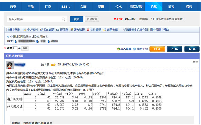 我們來說說光通量和功率的關(guān)系吧,需要專業(yè)術(shù)語描述的小編得讓工程師回答,您可以在線留言哦!話說回來想聽簡單一點(diǎn)的小編就理一理這關(guān)系吧,光通量的大小是通過電功率的轉(zhuǎn)化。所以從圖中我們能看出,盡管這位仁兄家的燈珠功率大于客供燈珠,但是它所轉(zhuǎn)化出來的光通量遠(yuǎn)低于客供燈珠。總的來說,他家LED光源質(zhì)量有待改進(jìn),按光臣照明工程師的回復(fù)以及各大神底部留言:“這是打臉的節(jié)湊,啪啪啪的打臉聲...”